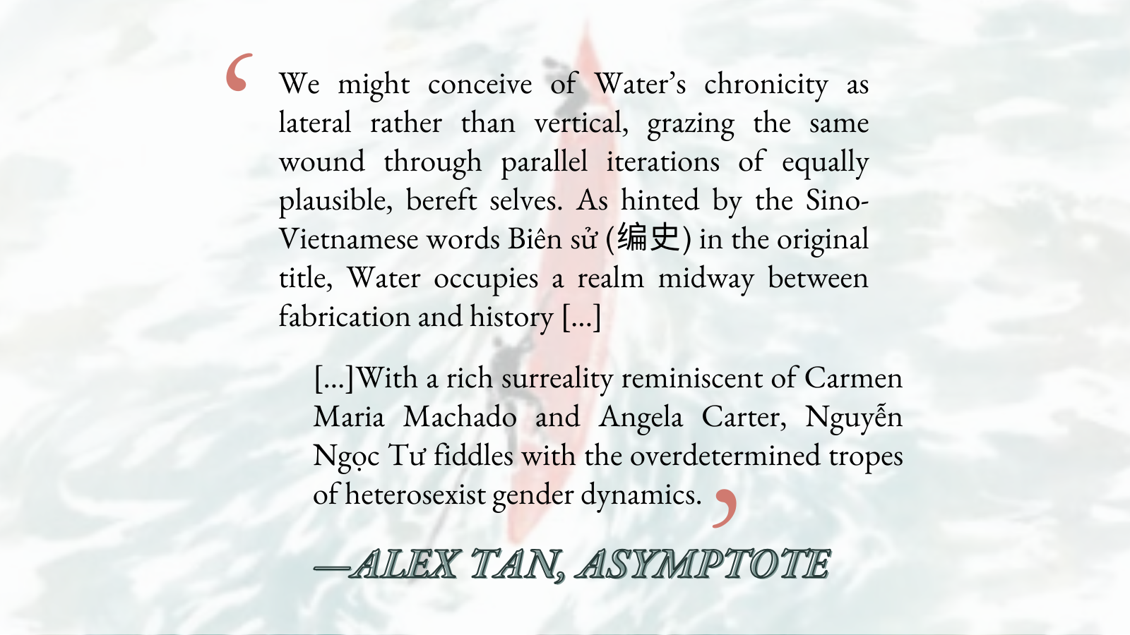 After an eight-year long hiatus, Nguyễn Ngọc Tư comes back with her second novel. Mesmerising, poignant, lyrical, existential, yet claustrophobic, Water: A Chronicle encapsulates the beauty of what contemporary Vietnamese writing has to offer.
